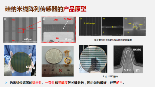 超灵敏硅纳米线生物传感器具有调制阈值电压和超小直径等优势,硅纳米线表面特异性结合带电的生物标志物,导致硅纳米线内部电导的改变,从而实现生物标志物的检测。通过调制阈值电压,改变传感器工作状态,使其在亚阈值区进行高灵敏度检测。团队通过侧墙转移技术制备了较小直径的硅纳米线阵列,且通过带有支撑结构的硅纳米线和源漏金属硅化物电极有效地降低生物传感器的寄生电阻,并且通过设计微流道有效减小了外界环境对检测造成的影响。