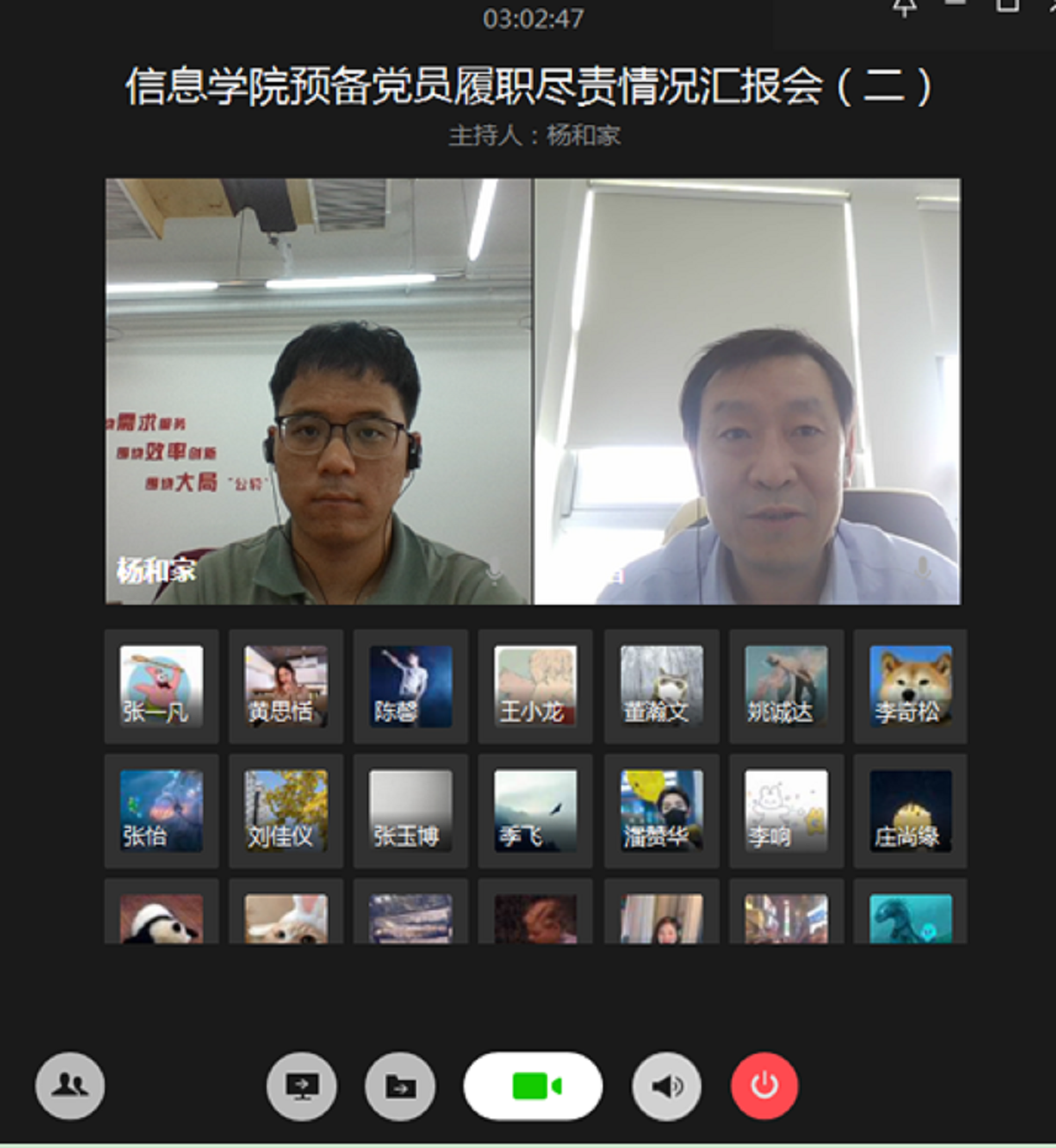 为加强对预备党员的教育和管理,综合考察预备党员一年预备期期间先锋模范作用的发挥,开云kaiyun登录入口党委于5月21日和22日下午在企业微信召开了两场“预备党员履职尽责情况汇报会”。学院党委委员、支部书记、学生党建中心成员对63名预备党员在预备党员期内的履职尽责情况进行了考核评价。会议由学院学生党建中心副主任杨和家主持。