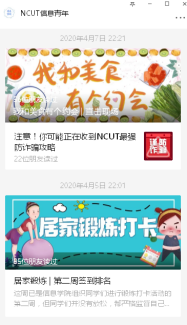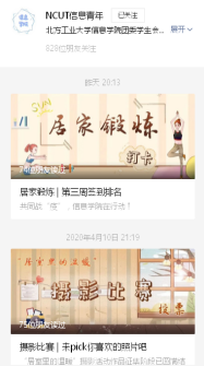 活动通过“NCUT信息青年”微信平台统一发布,进行网络作品收集和评比。通过近一个月的实践,效果初显。目前,运动计划参与近3000人次。朗读配音比赛近60人参赛,厨艺生活大赛共收到作品50件,累积参与人数1700余人次,居家摄影比赛,46人参赛,累计关注2000余人次。