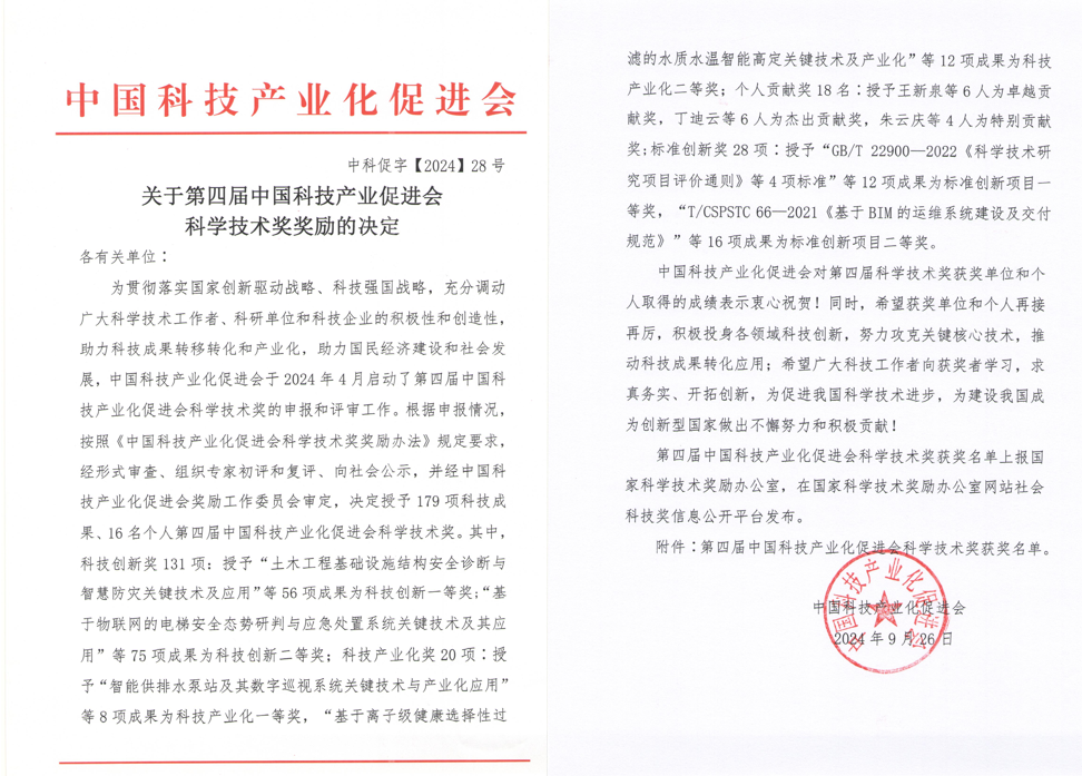 中国科技产业化促进会科学技术奖是经国家科学技术奖励工作办公室批准设立的社会科技奖项,由中国科技产业化促进会评选,旨在充分调动广大科学技术工作者、企业家及有关人员的积极性和创造性,促进科技产业化,助力经济建设和社会发展。2024年度共评科技创新奖共计131项,一等奖为56项,二等奖75项。